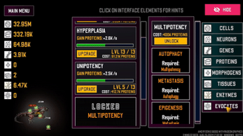 - Genes: These are needed to increase the amount of cells you gain from clicking. The more gens you have, the more cells you gain.